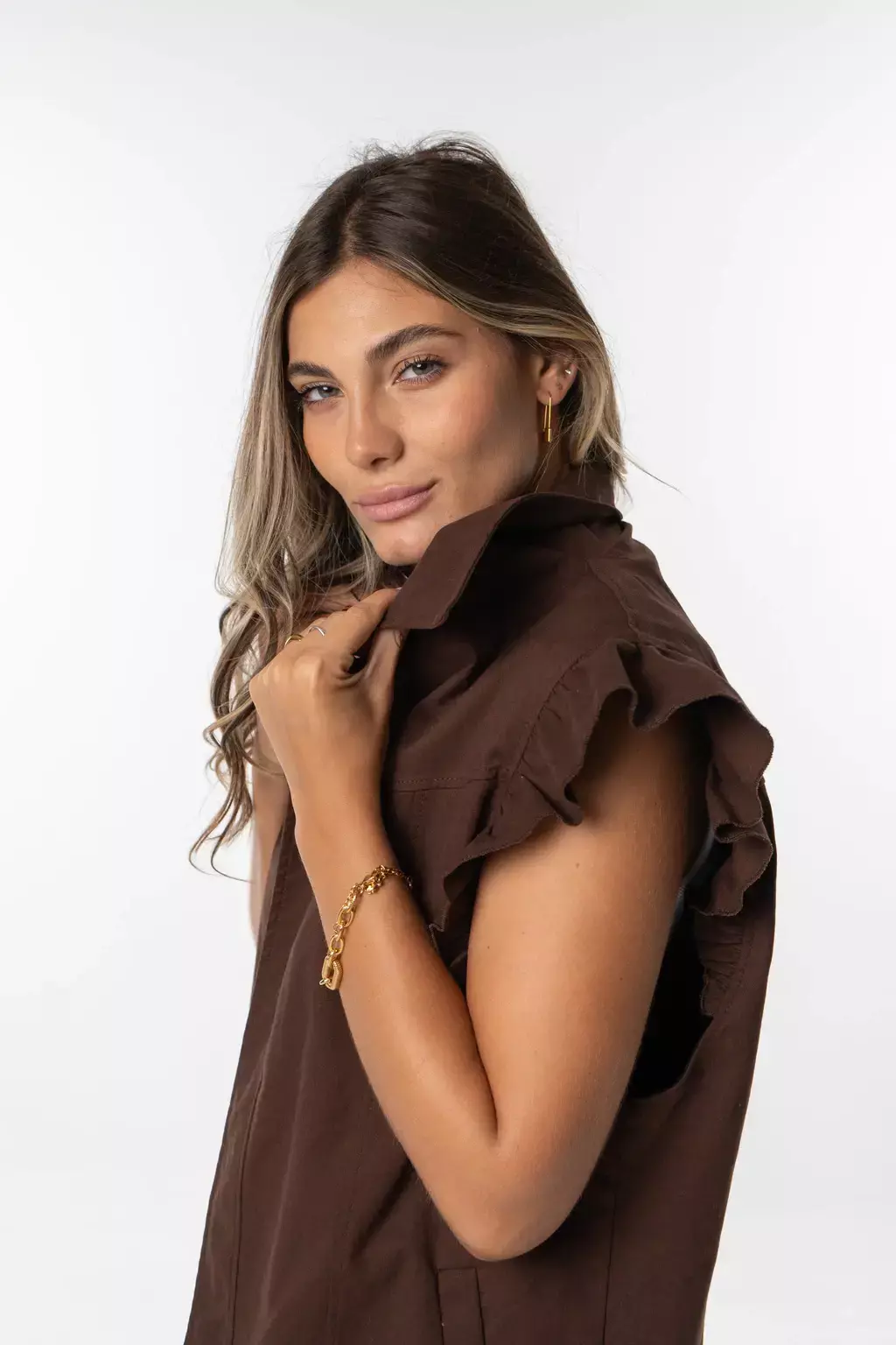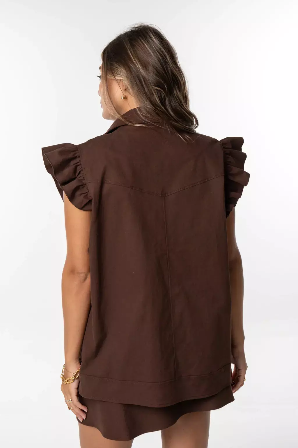 Chaleco con volados en mangas y bolsillos. Este chaleco en gabardina con spandex combina estructura y movimiento en una silueta versátil, con volados que le aportan un toque distintivo sin perder la simpleza.